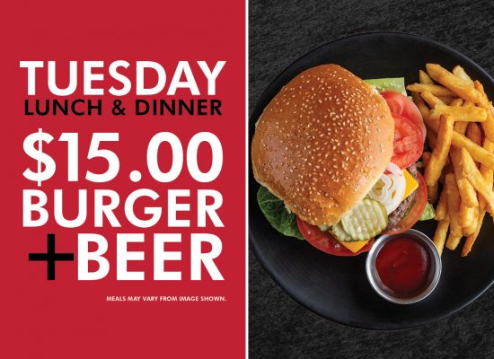 Every Tuesday available lunch + dinner our $15 Burger & Beer will leave you satisfied every time.