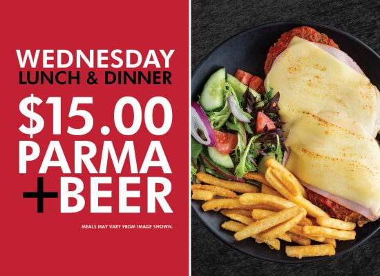 Every Wednesday we feature our $15 Parma & Beer. Choose from traditional parma, gluten free parma or when in season our special vegetarian parma using eggplant and spinach instead of the traditional chicken and ham.